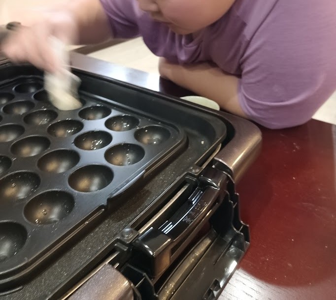 タネを ホットプレートたこ焼きVer.に~ ぽい~っ(=゚ω゚)ノ とね♪ アーンド ウインナー