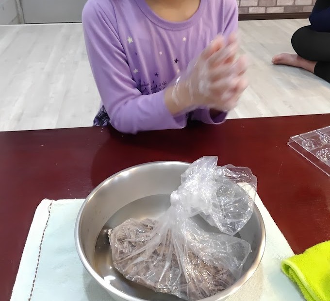 作りを 始めますぅ~♪ まずは 手洗いを 行いまして 手袋 装着! 各自、ビニール袋に
