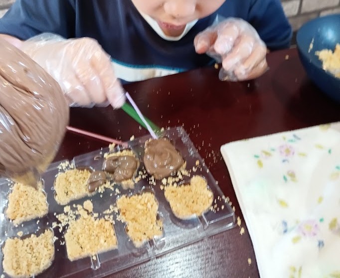 チョコを inっ! 湯煎して トローリ おいしく 仕上げたら クランチしたクッキーを 型に