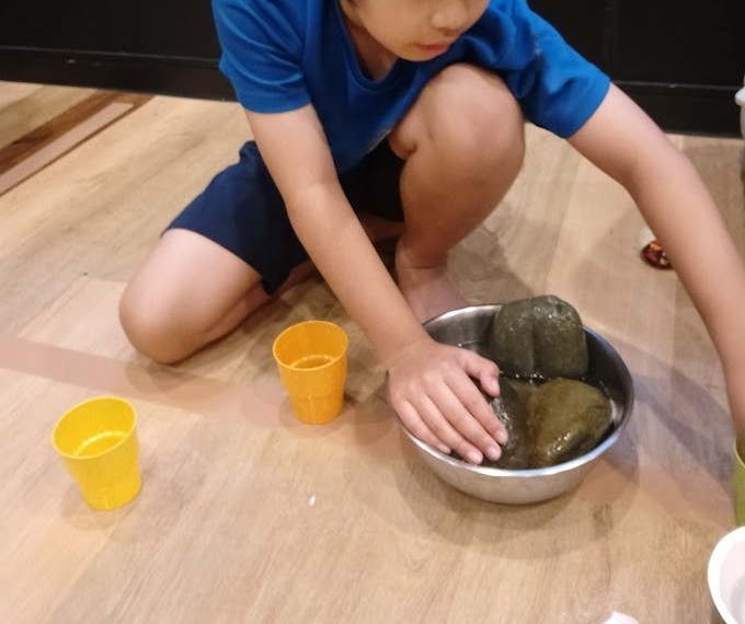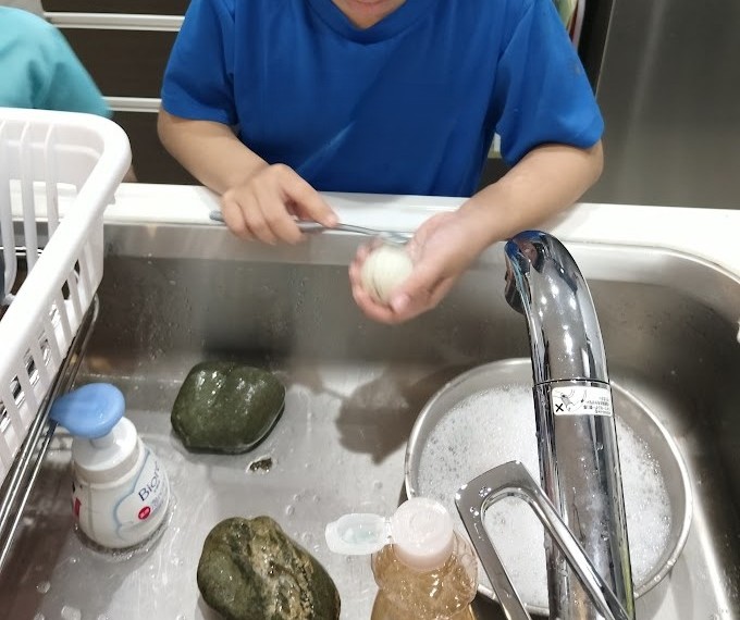 見に行くと 石を せっけんで 洗浄中っ! きれいに 洗って お客さんを まったんですが