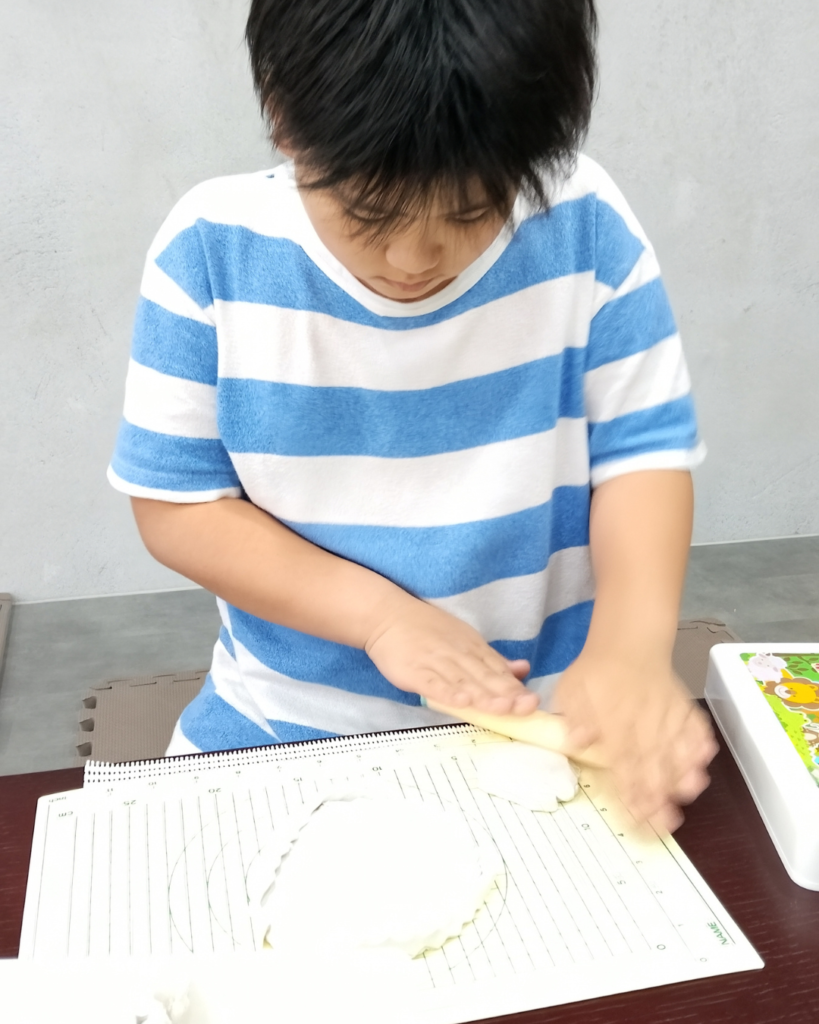 今日の創作活動では、支援員とRくんで「本物そっくりのパイを作ろう!」と粘土細工対決を行いました。