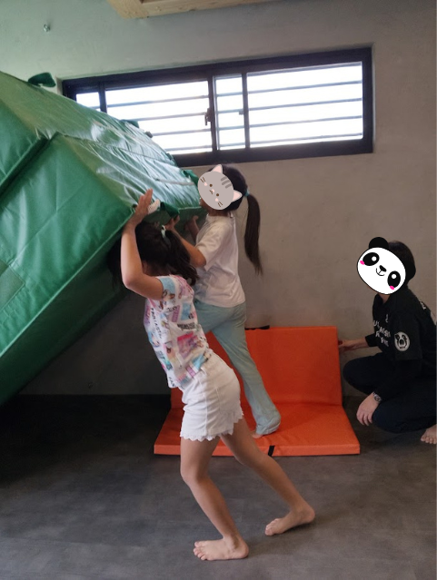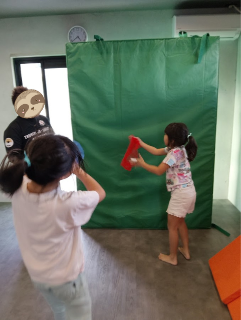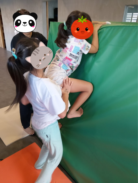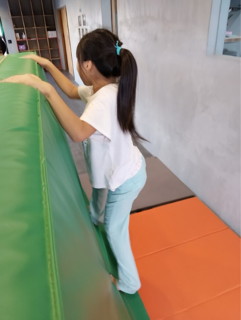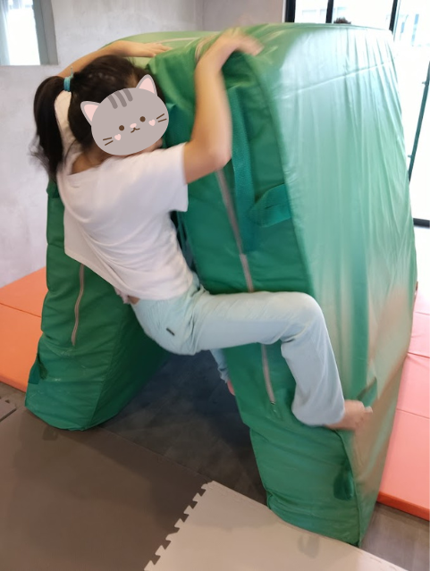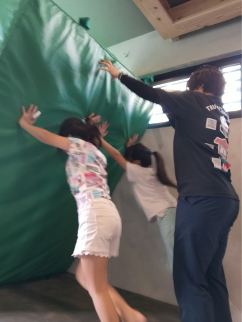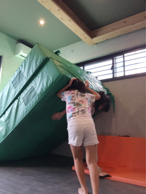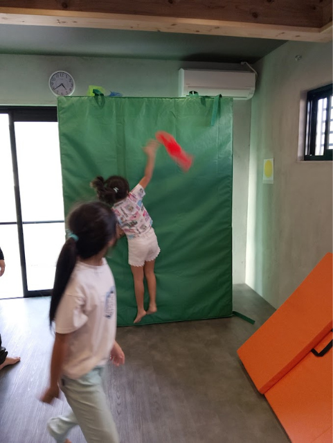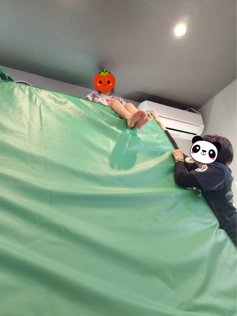 マットの上ではSさんと一緒にスカーフを投げ、駆け登って取ったり、急斜面を滑ったりとスリル満点の遊びも楽しみました。