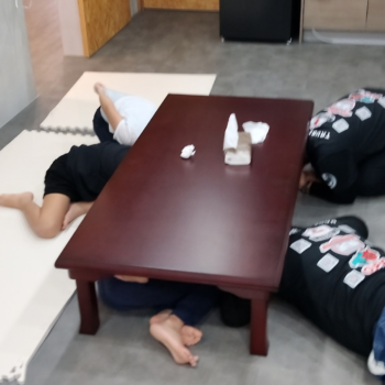 見事1周をクリアすると、勢いそのままに「もう1周チャレンジ!」と2周目へ。休み休みしながらも、最後まで自分の足で歩ききることができました。 「3周目はいく?」と聞くと、「もうダメ~!」と爽やかにギブアップ(笑)。「疲れた~」とマットにごろんと寝転ぶ姿からは、「2周できたよ!」という大きな達成感が伝わってきました。