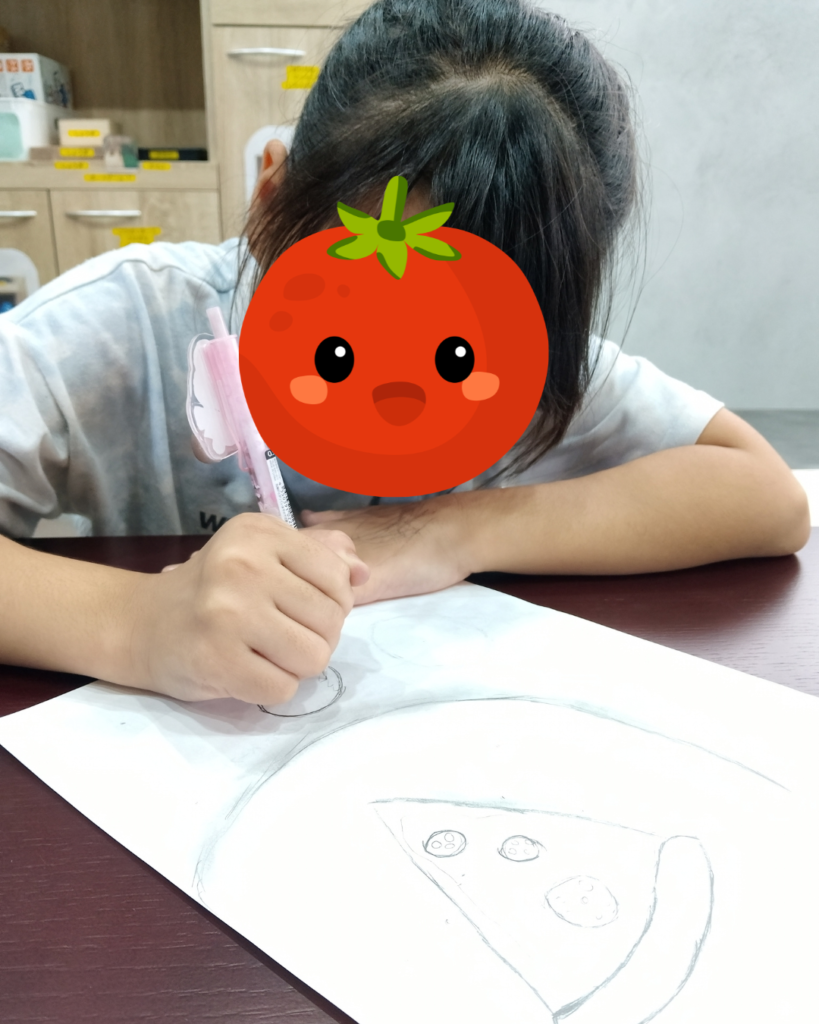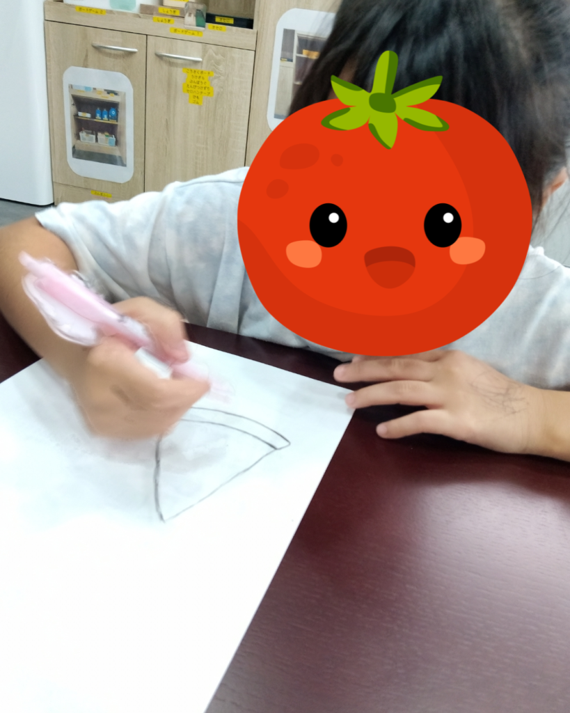 「Yさん(支援員)は丸いピザね!Mは三角のピザ描くから~」と同じものですが、形状が違うものを互いに描き分けたり、「影もつくろ~♪」と言って、太い線を描いたかと思うと・・その線を指でこすってぼかすことにより「影」を表現したり…。工夫が止まりません♪