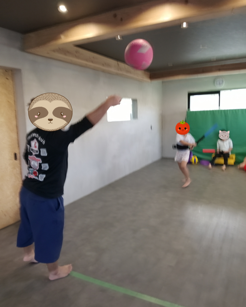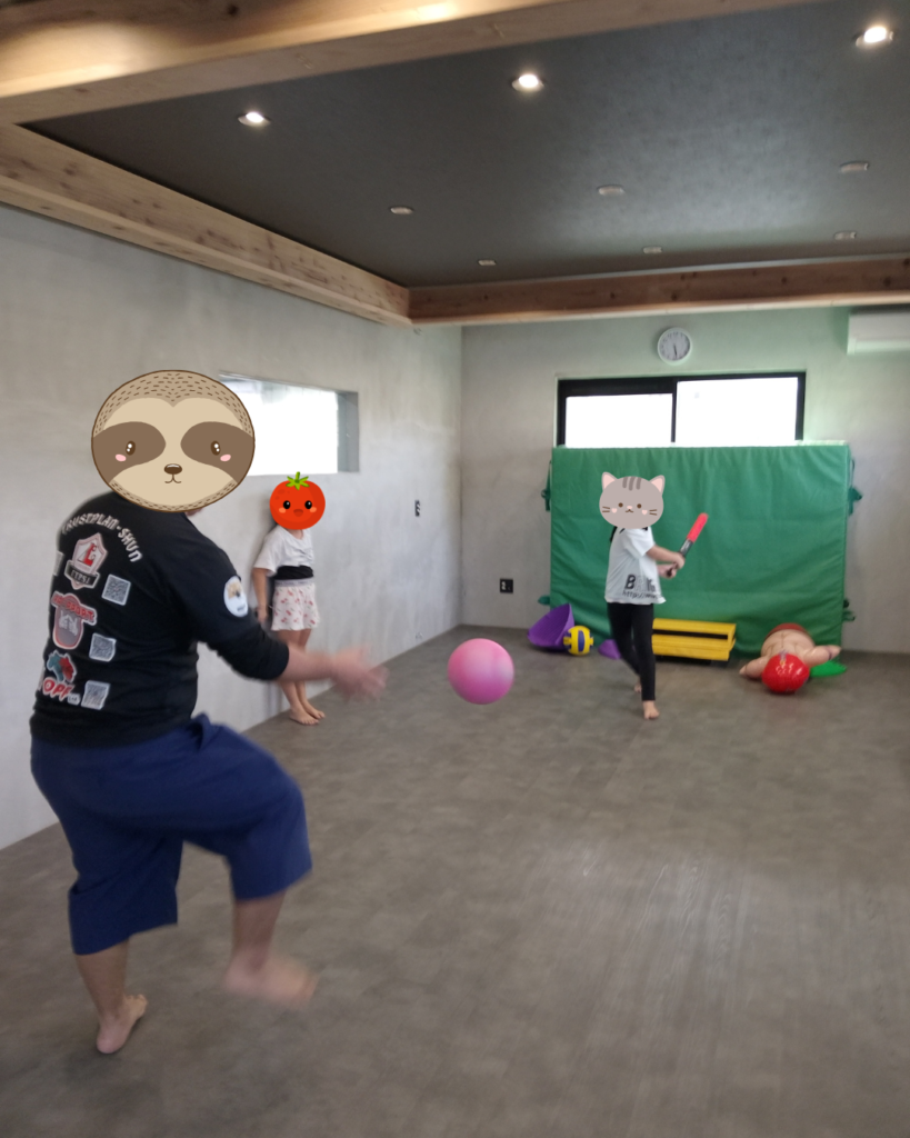 ルールを守ることを前提に、ソフトバレーボールを使ったバッティング練習しました。