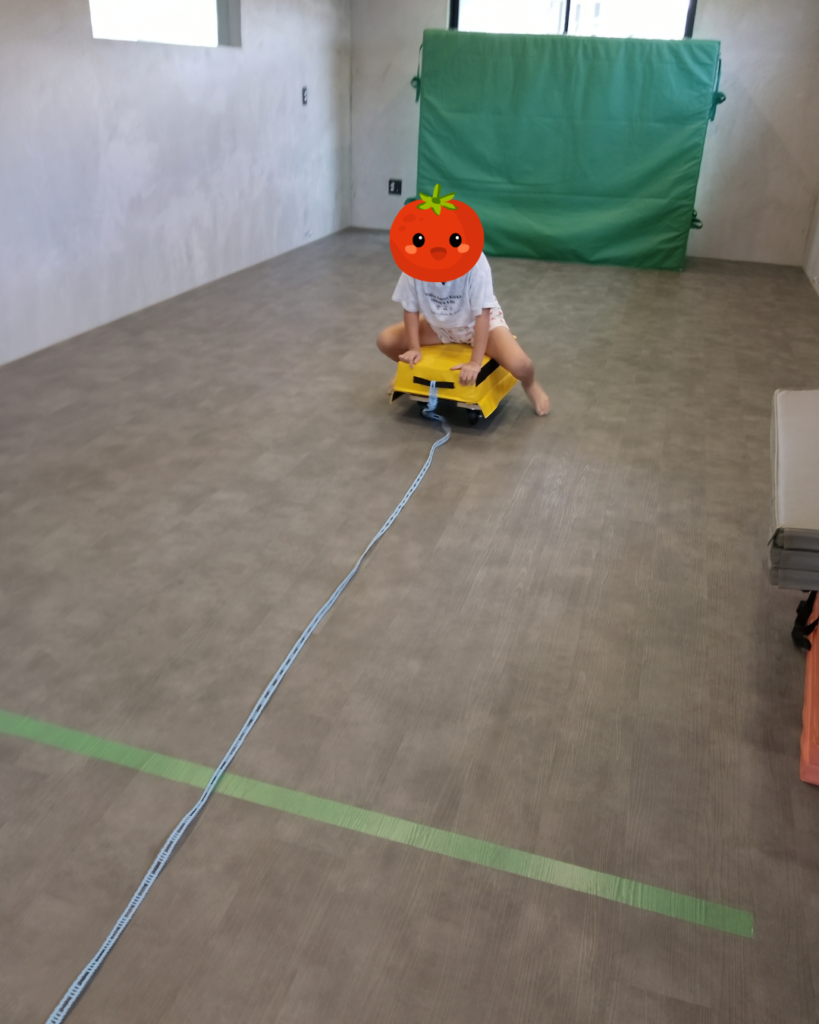 Sさんは、跳び箱にまたがって猛スピードで疾走!カーブでは片足を使ってドリフト気味に方向転換し、最後は指定の場所にピタッと止まる「縦列駐車」を披露してくれました。